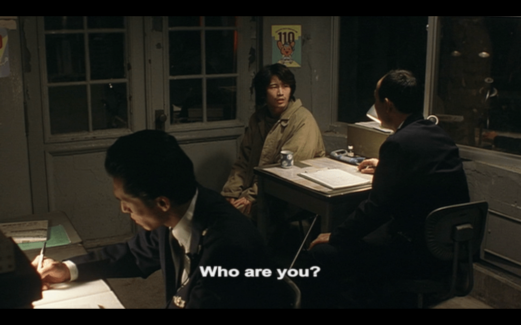 The movie’s murders are all acheived by a serial hypnotist. In each instance, he achieves this by presenting himself as a confused man in need of help, which causes people to drop their guard and see him as harmless. Naturally, the worried citizens ask probing questions about him, but he effortlessly turns the questions back on them, always while lighting a cigarette or pouring water to invoke a calm, receptive state in his interlocutors. The essential question he asks is, “Who are you?”